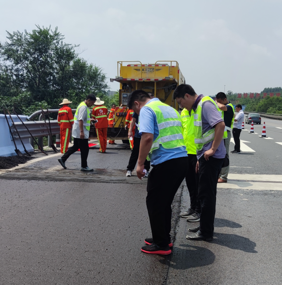 下圖為微表處攤鋪完成20分鐘后,稀漿封層機還未撤離現(xiàn)場時,施工現(xiàn)場領導監(jiān)理進行踩踏,已經不粘鞋。