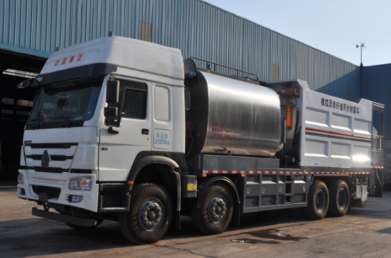 3、該型號的纖維同步碎石封層車不需舉升料斗就可實現(xiàn)石屑撒布施工,方便隧道涵洞施工、橋梁施工、以及彎道施工。