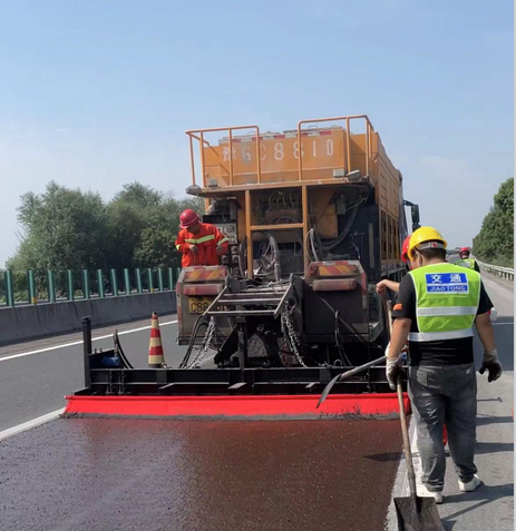 本次的微表處施工,兩個小時后可以開放交通,快凝效果明顯。慢裂快凝型乳化瀝青是采用我公司生產(chǎn)的CMK1型微表處瀝青乳化劑進(jìn)行乳化生產(chǎn)的,如圖可以看出滿足拌合時間,且攤鋪成功。